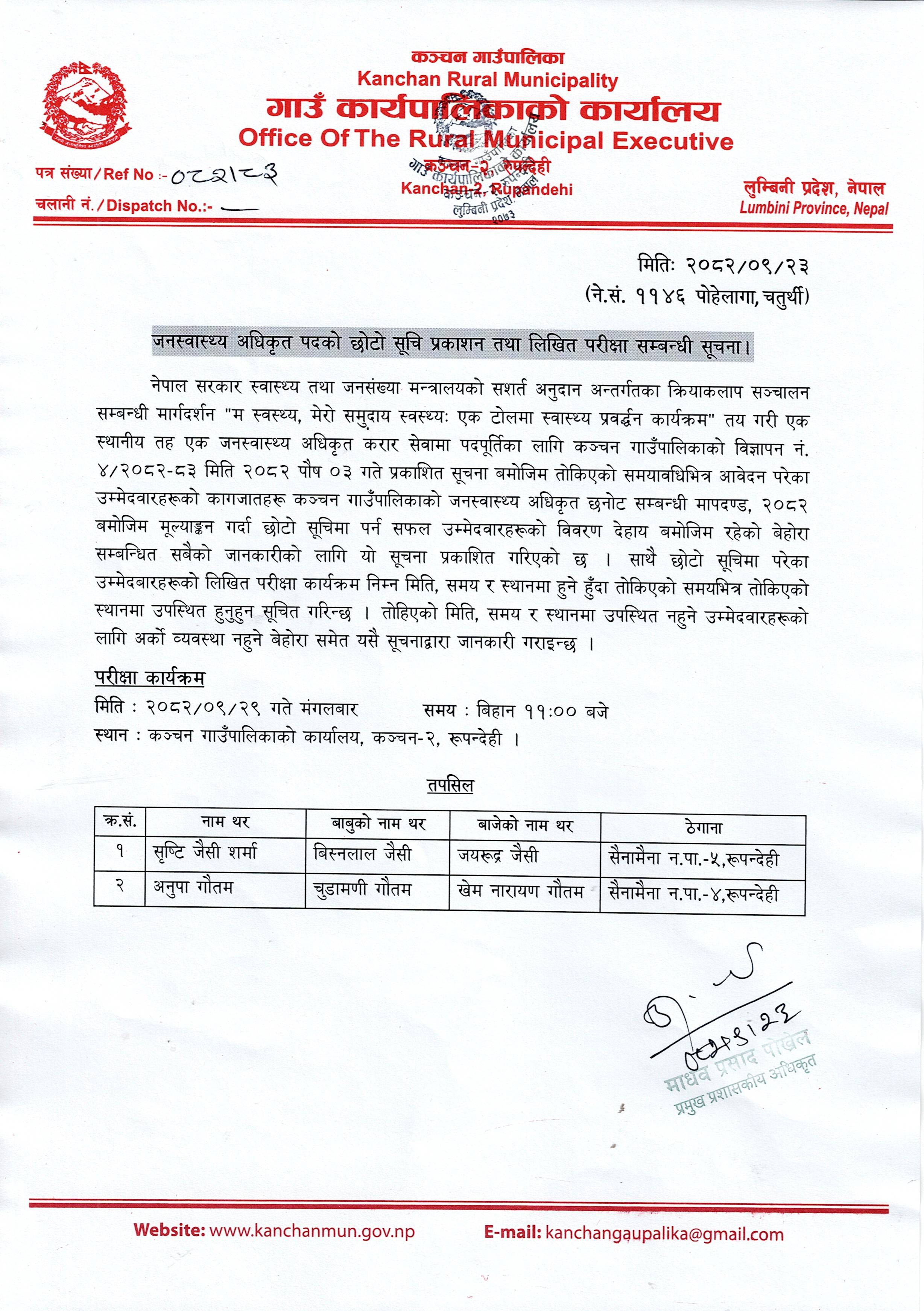 जन स्वास्थ्य अधिकृत पदको छोटो सूचि प्रकाशन तथा लिखित परीक्षा सम्बन्धी सूचना ।