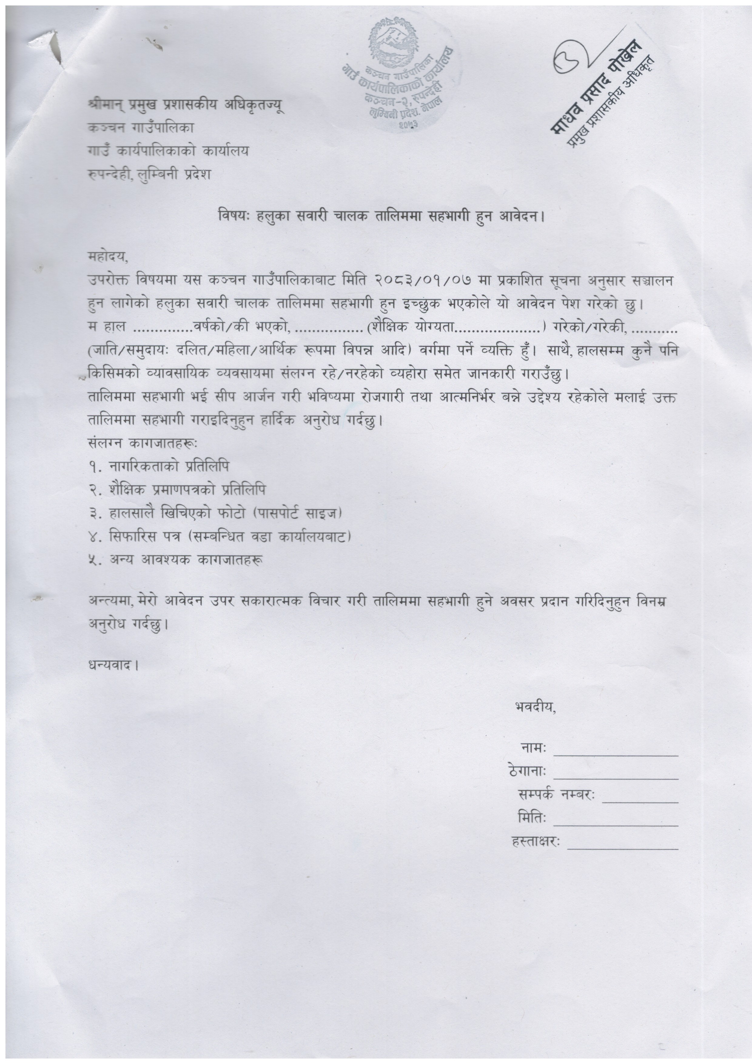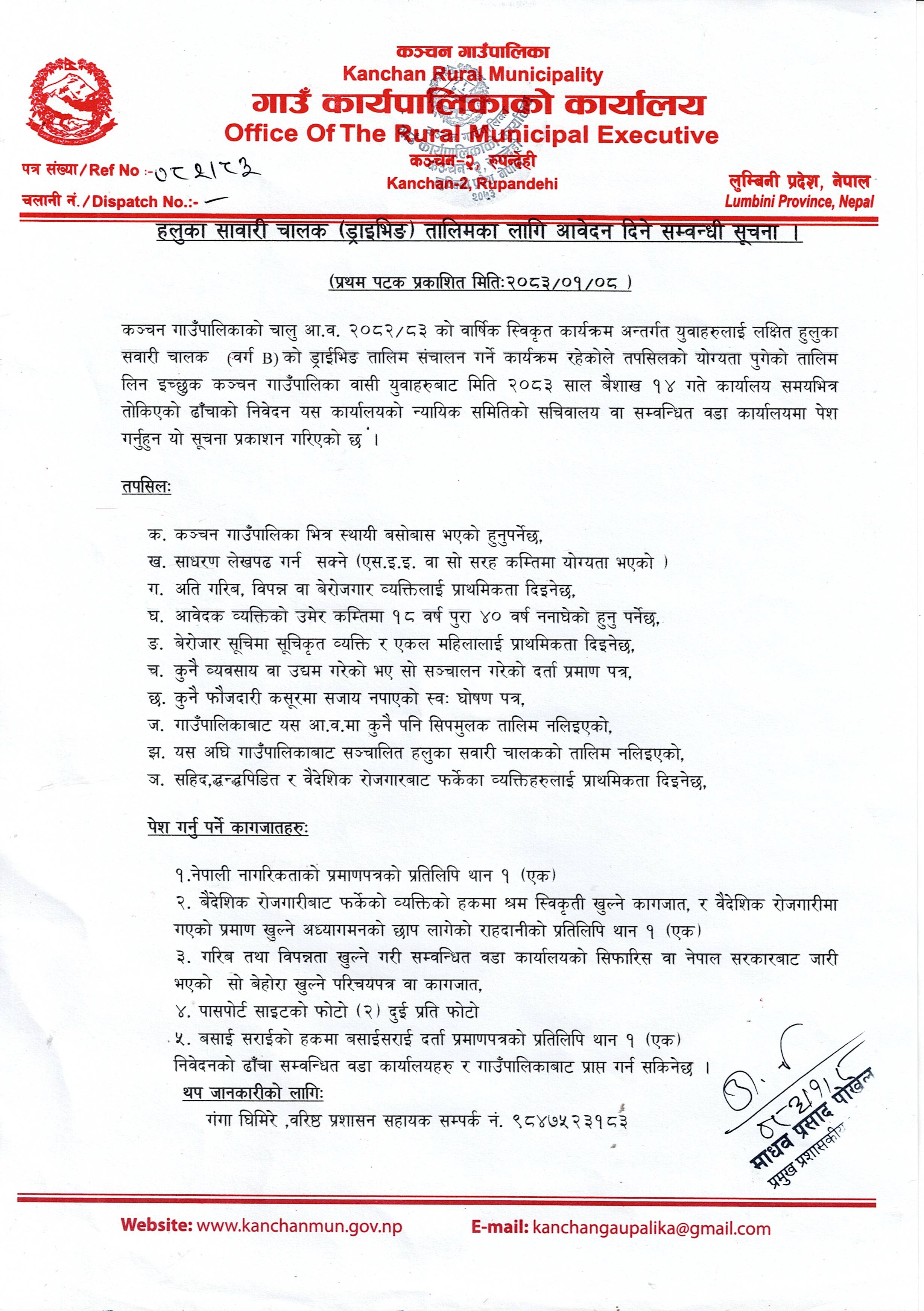 ड्राइभिङ्ग तालिमको लागि आवेदन दिने सम्बन्धी सूचना ।