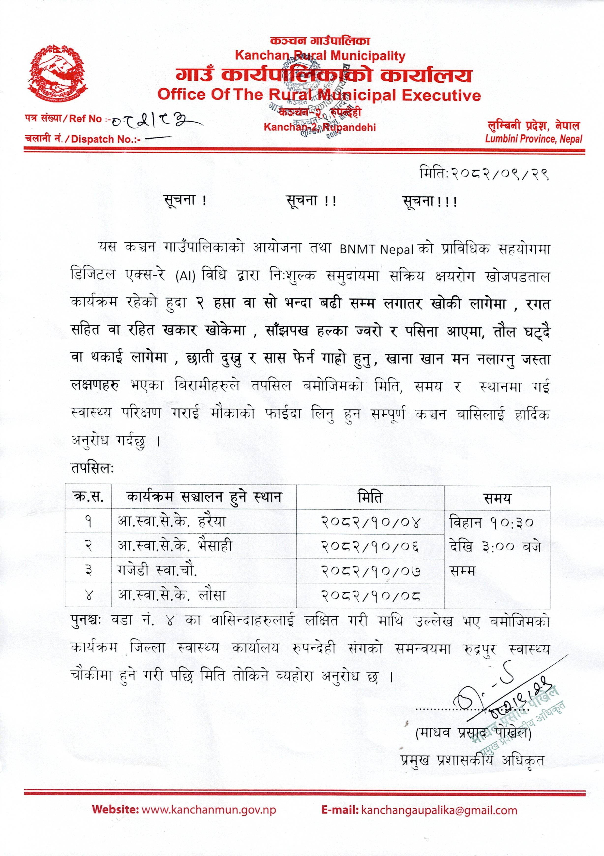 नि:शुल्क रुपमा समुदायमा सक्रिय क्षयरोग खोजपडताल कार्यक्रम सम्बन्धी सूचना ।