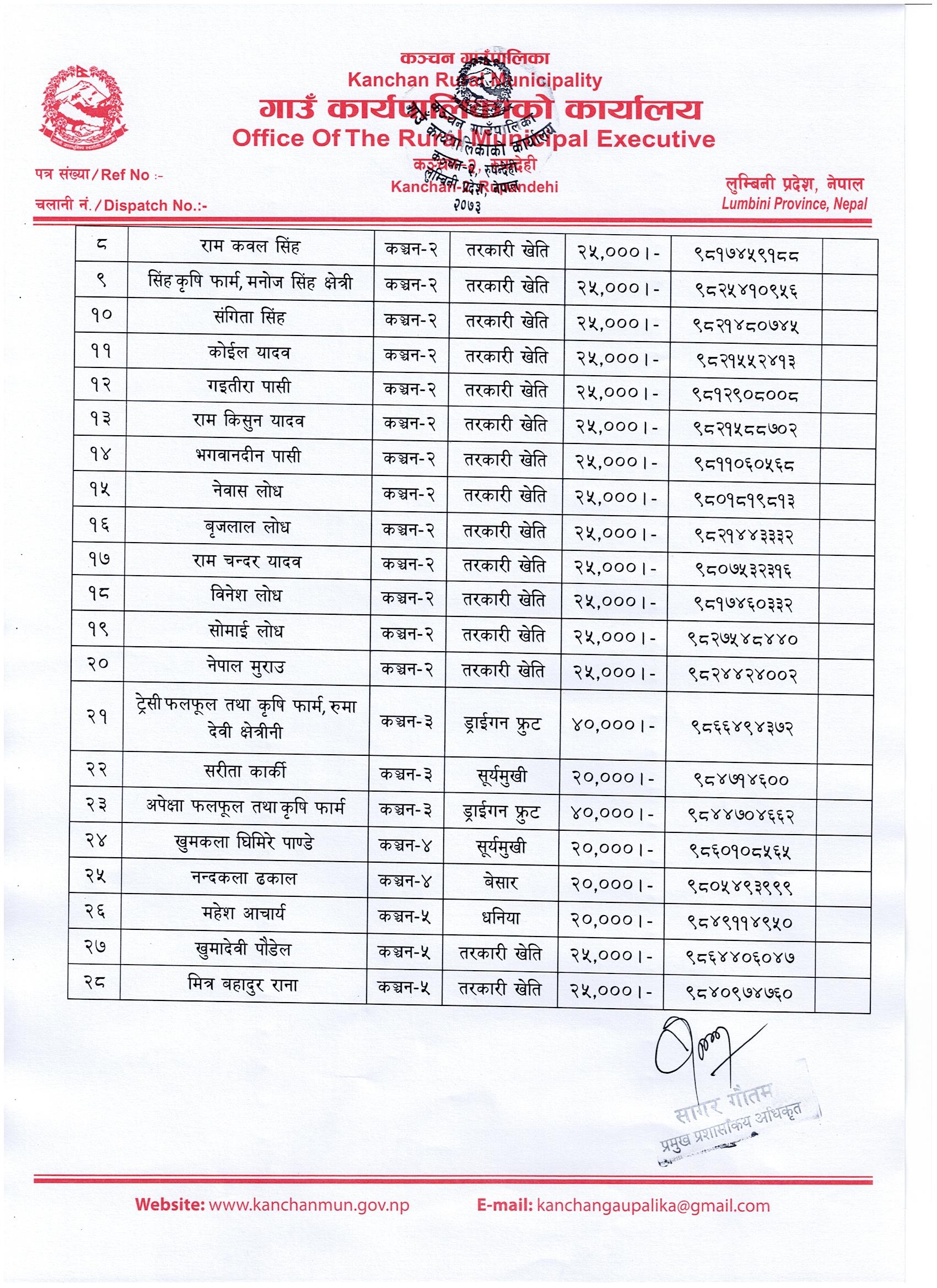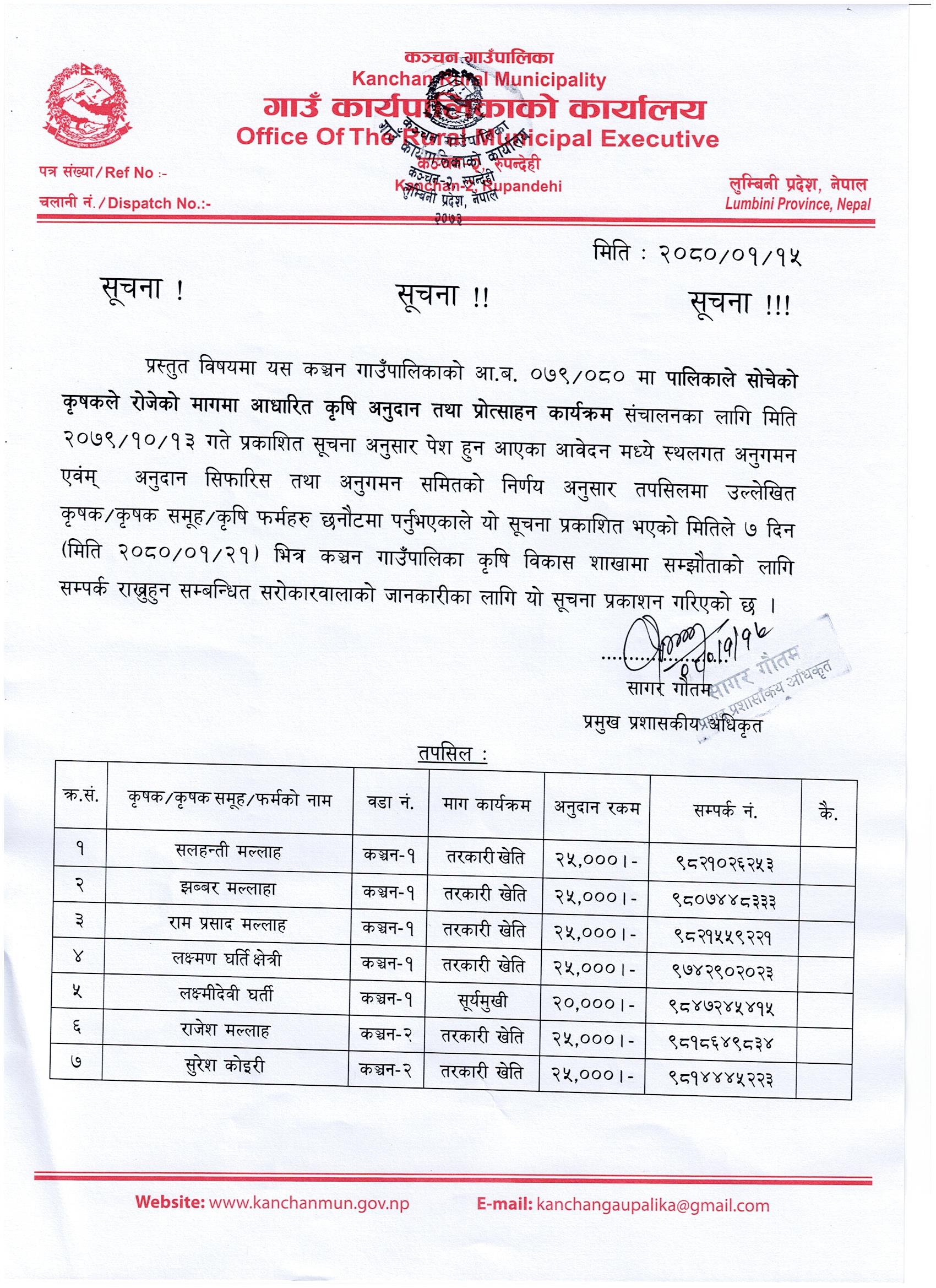 पालिकाले सोचेकाे कृषकले राेजेकाे मागमा आधारित कृषि अनुदान तथा प्राेत्साहन कार्यक्रमकाे छनाेट सुची सम्बन्धमा ।