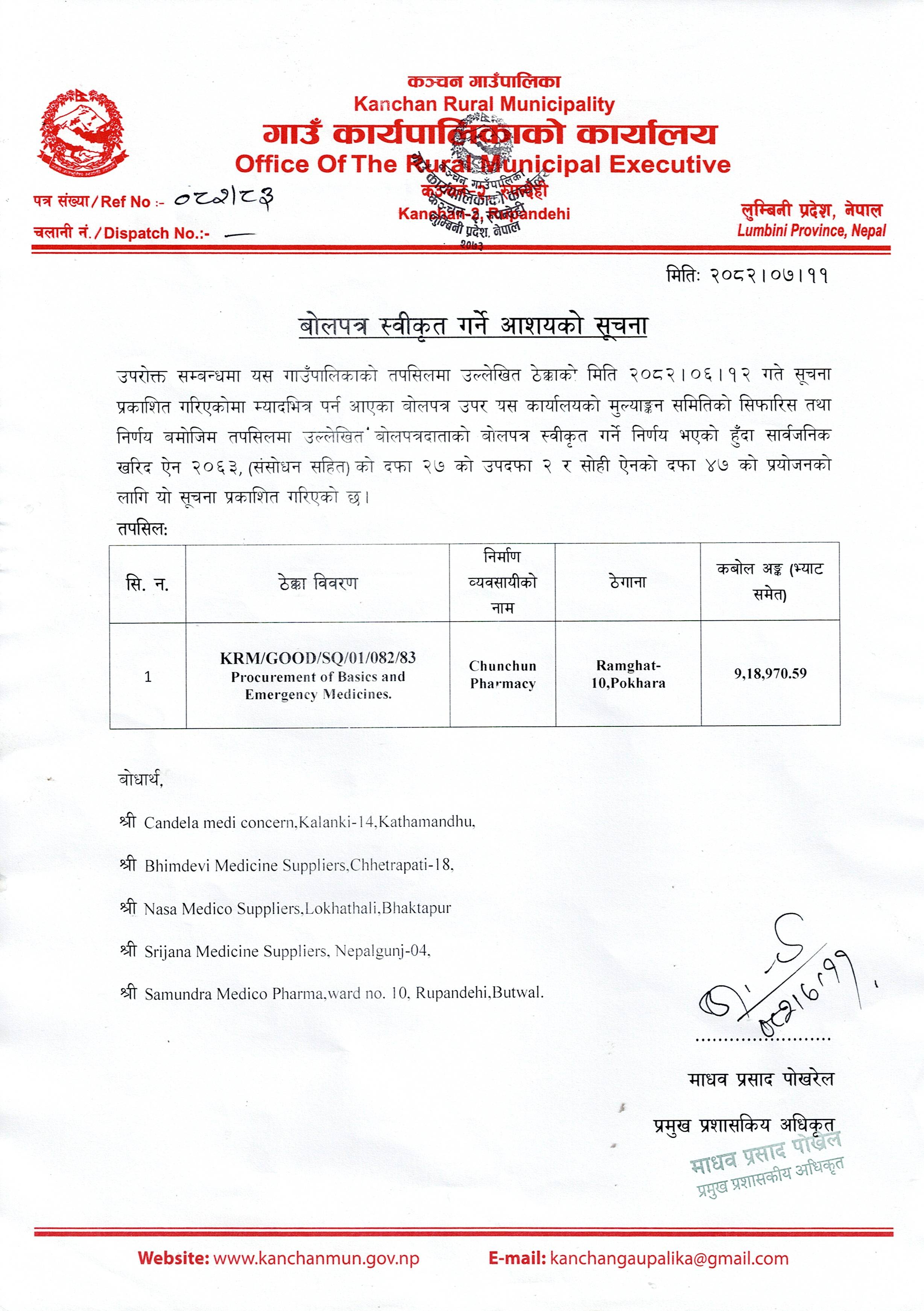 बोलपत्र स्वीकृत गर्ने आशयको सूचना ।