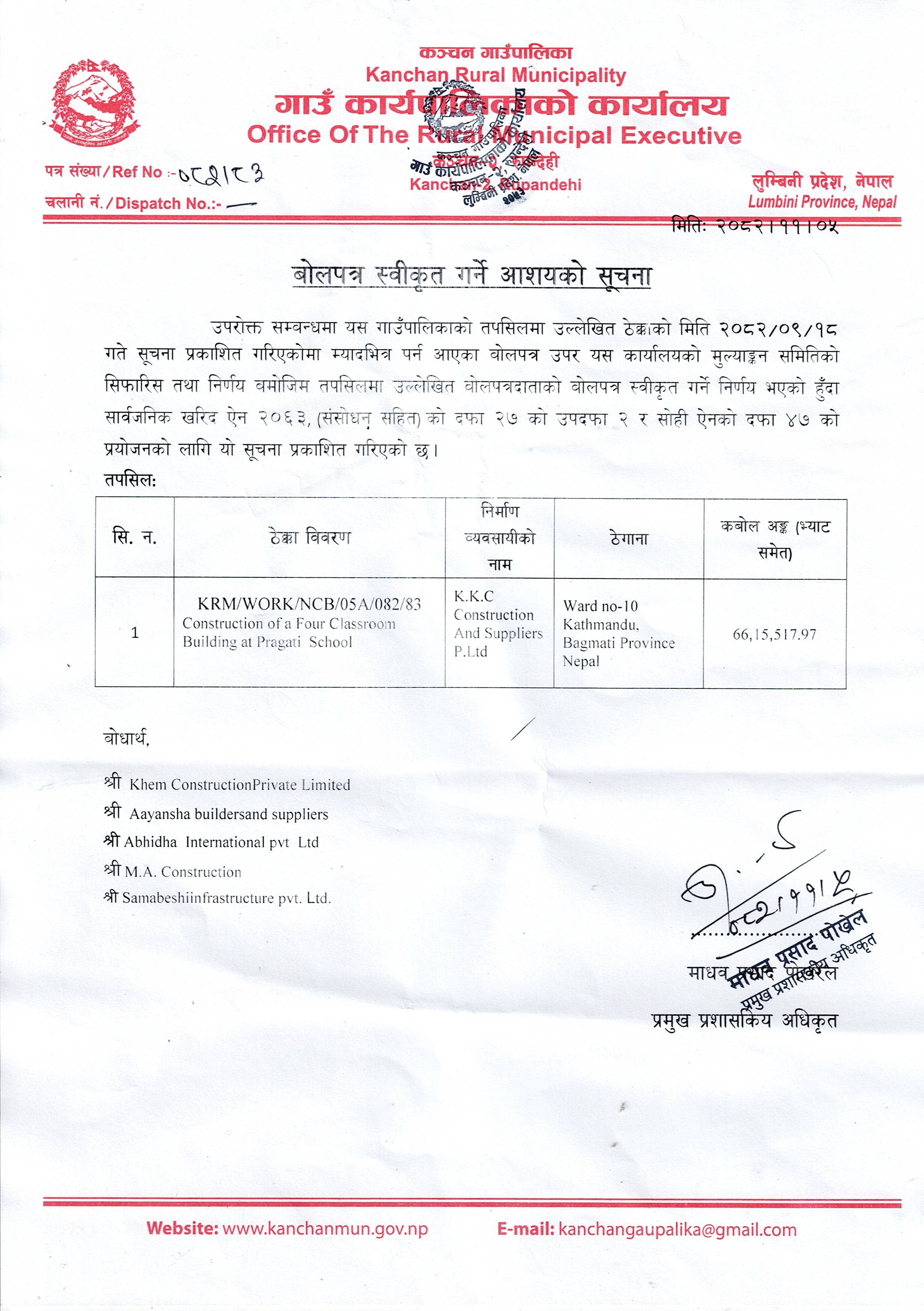 बोलपत्र स्वीकृत गर्ने आशयको सूचना ।