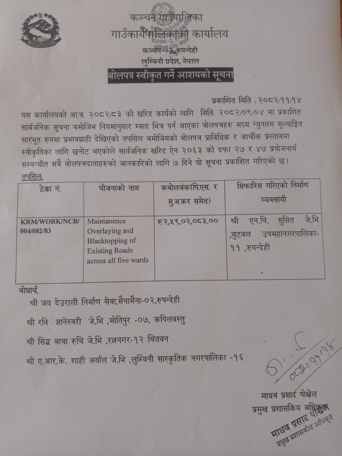 बोलपत्र स्वीकृत गर्ने आशयको सूचना ।