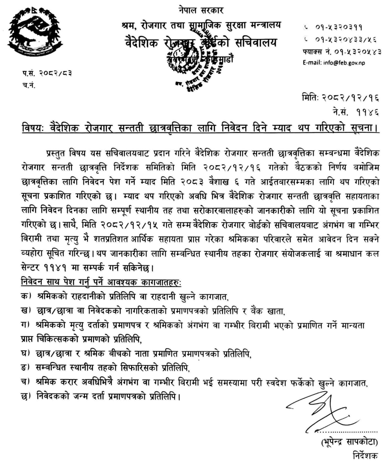 वैदेशिक रोजगार सन्तती छात्रवृत्तिका लागि निवेदन दिने म्याद थप गरिएको सम्बन्धी सूचना ।