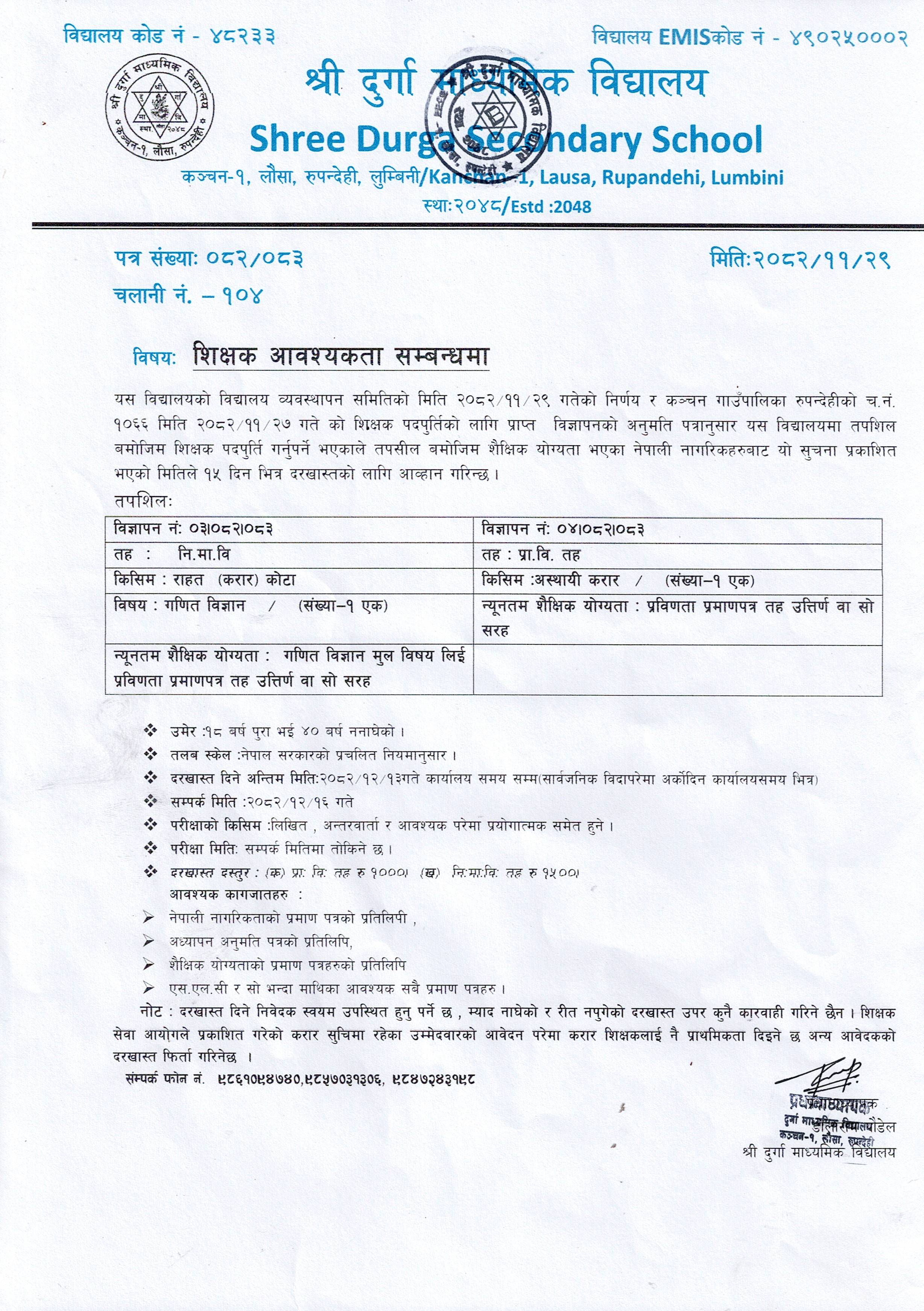 शिक्षक आवश्यकता सम्बन्धी सूचना ।