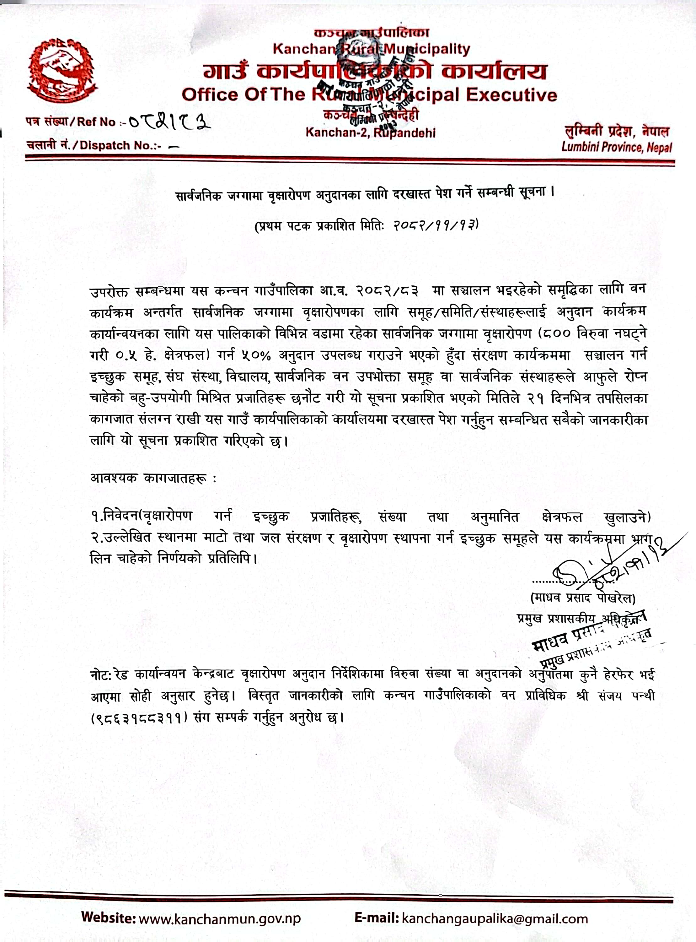सार्वजनिक जग्गामा वृक्षारोपण अनुदानका लागि दरखास्त पेश गर्ने सम्बन्धी सूचना ।