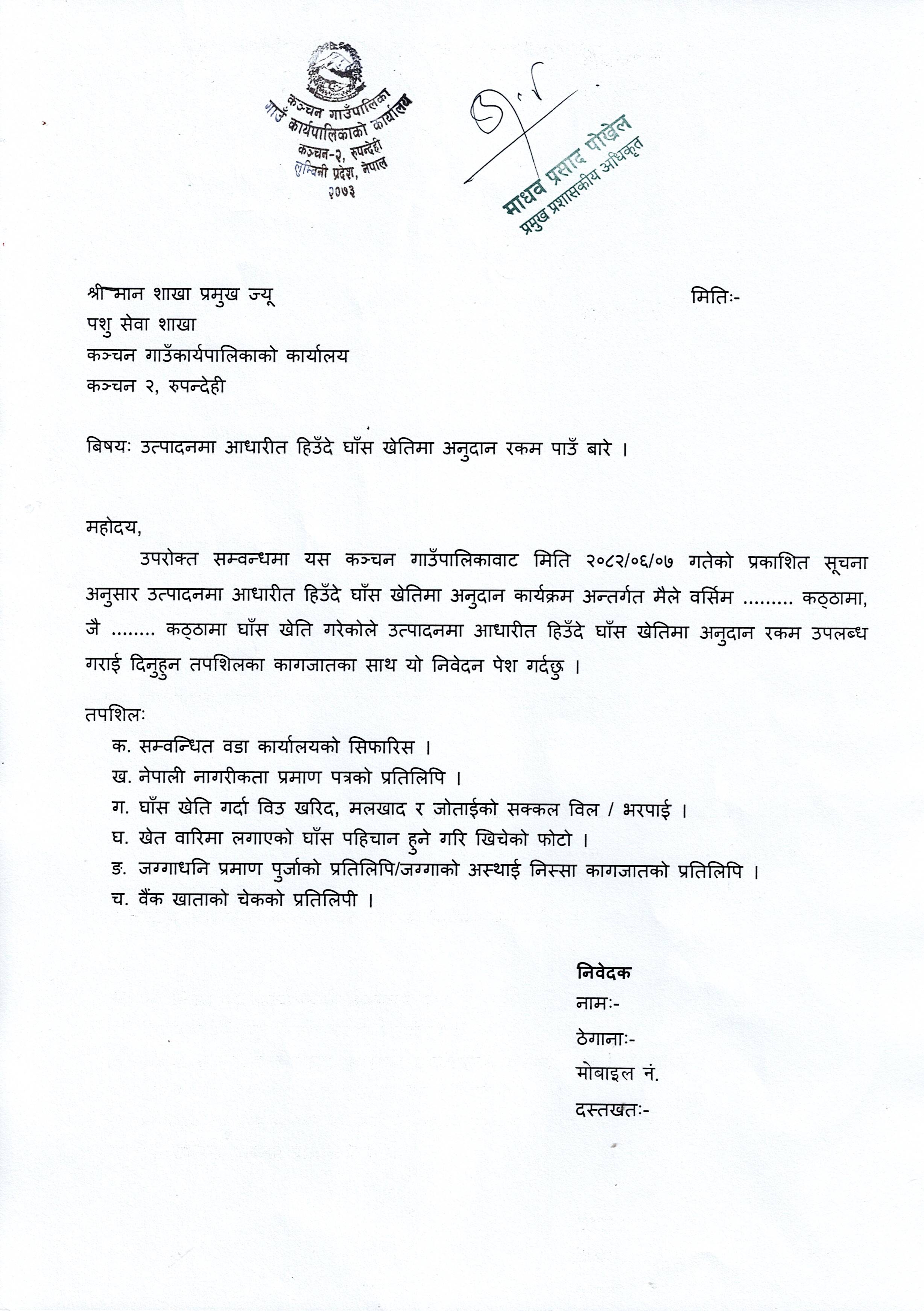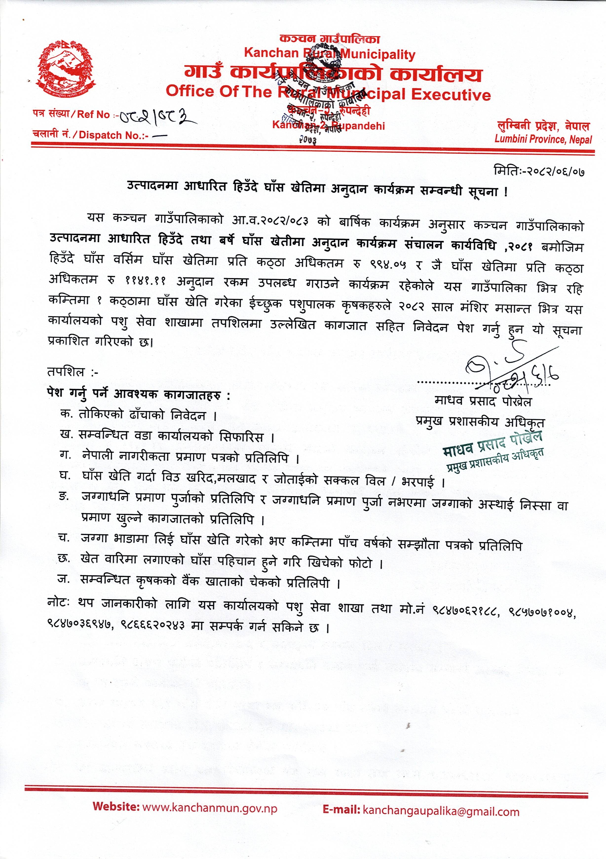 उत्पादनमा आधारित हिउँदे घाँस खेतिमा अनुदान कार्यक्रम सम्बन्धी सूचना ।