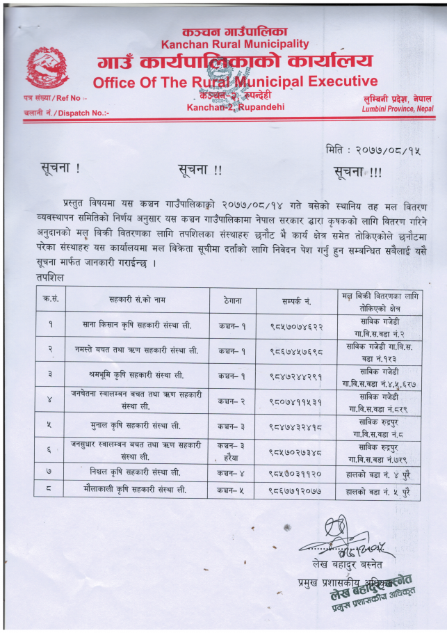 कञ्चन गाउँपालिका कृषि विकास शाखा द्वारा जारी सूचना