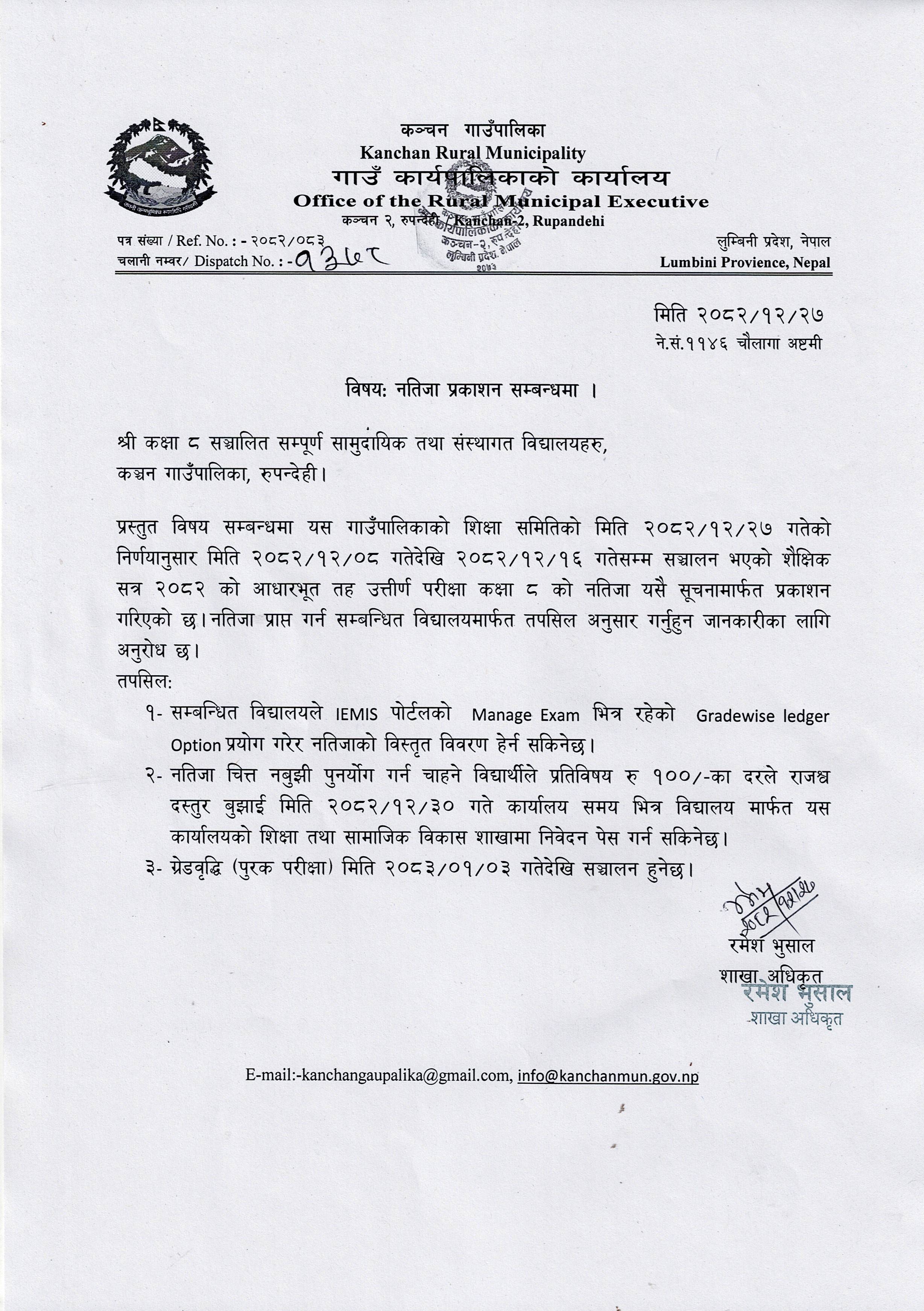 नतिजा प्रकाशन सम्बन्धी सूचना ।