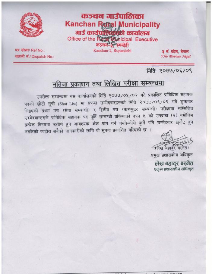 प्राविधिक सहायकको नतिजा प्रकाशन तथा लिखित परीक्षा सम्बन्धी सूचना।