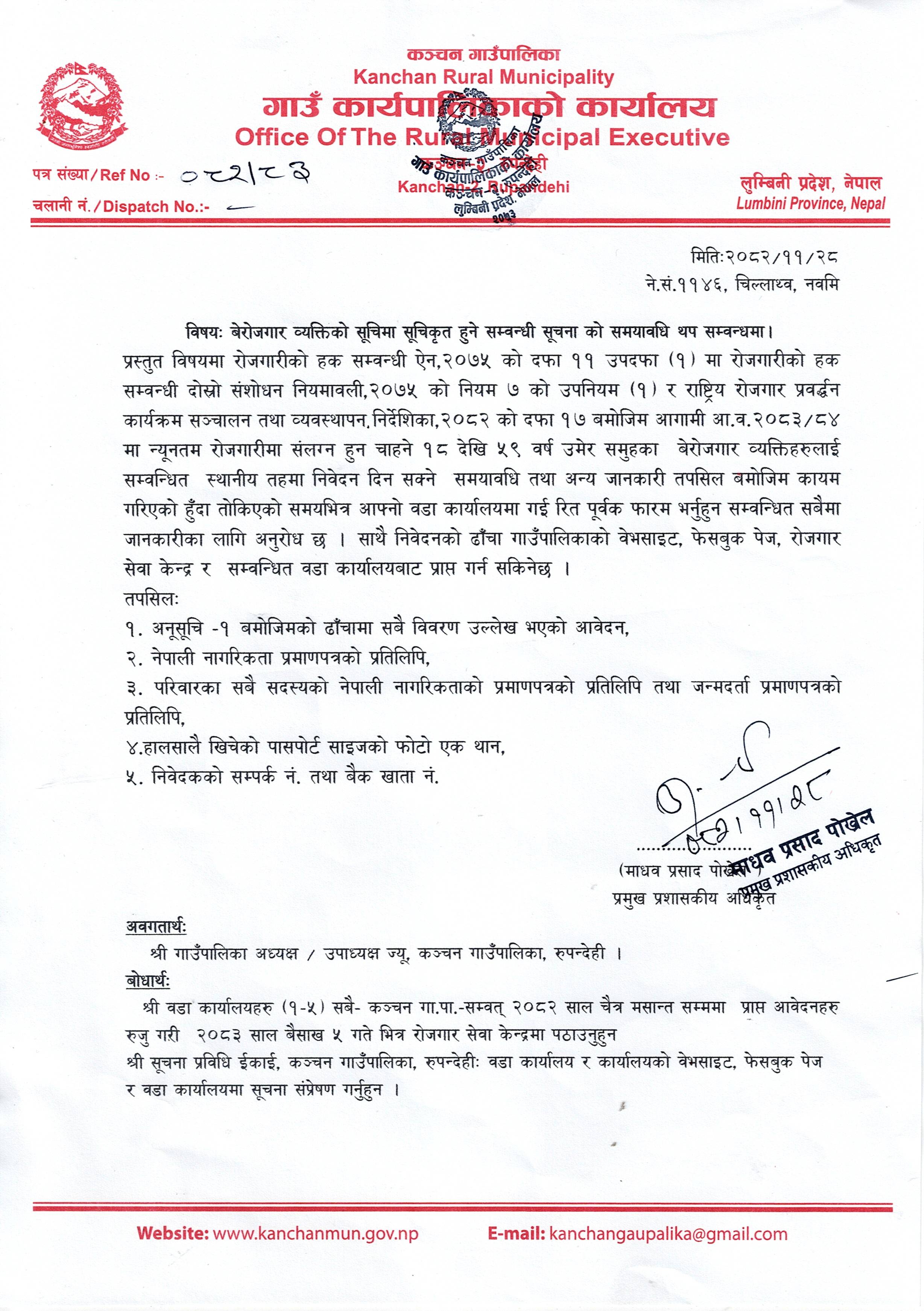 बेरोजगार व्यक्तिको सूचिमा सूचिकृत हुने सम्बन्धी सूचना को समयावधि थप सम्बन्धमा ।