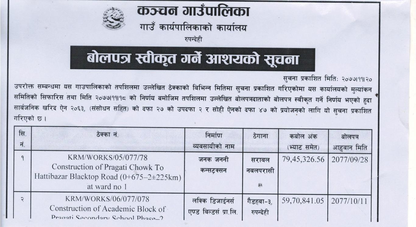 बोलपत्र स्वीकृति गर्ने आशयको सूचना।