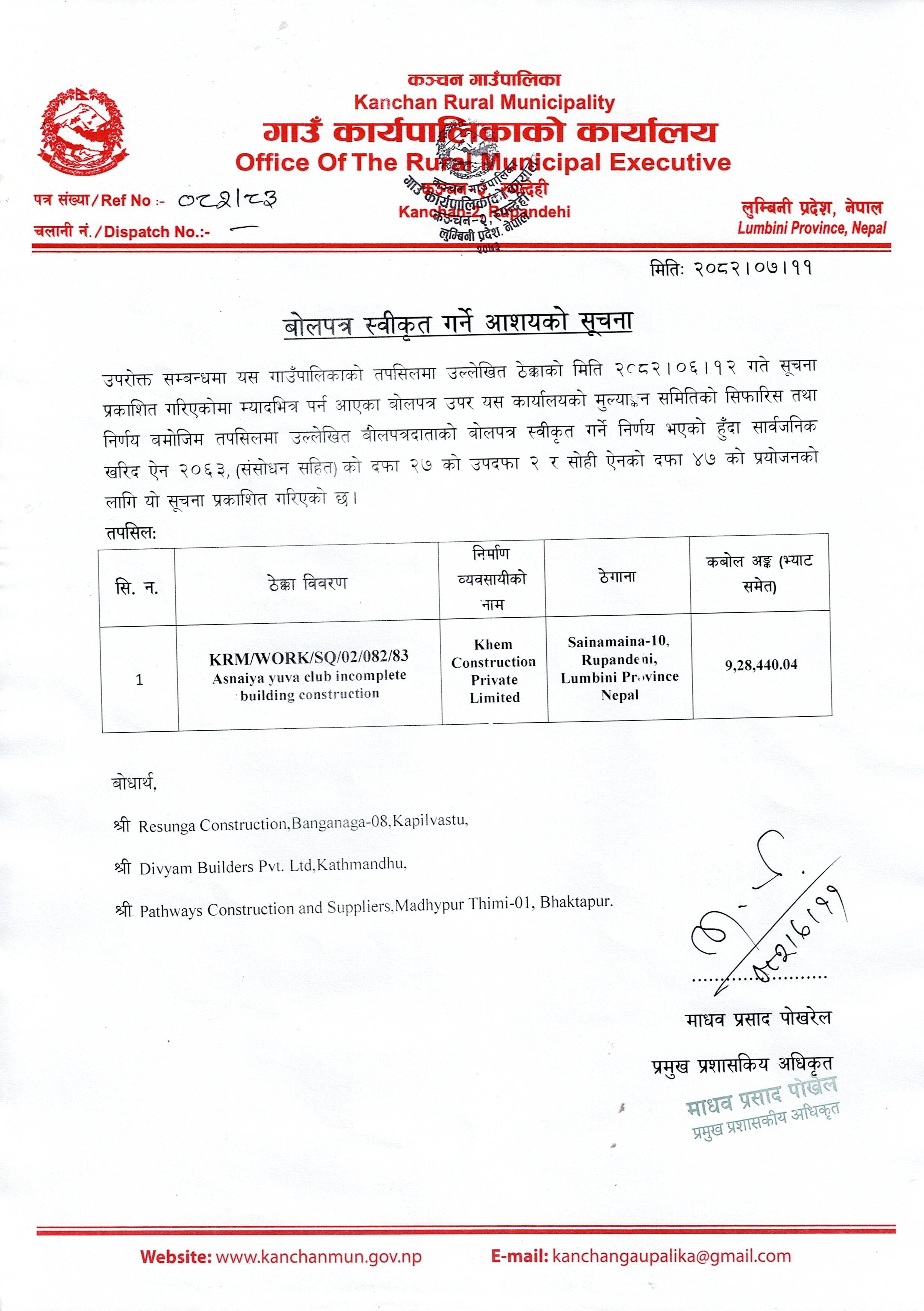 बोलपत्र स्वीकृत गर्ने आशयको सूचना ।