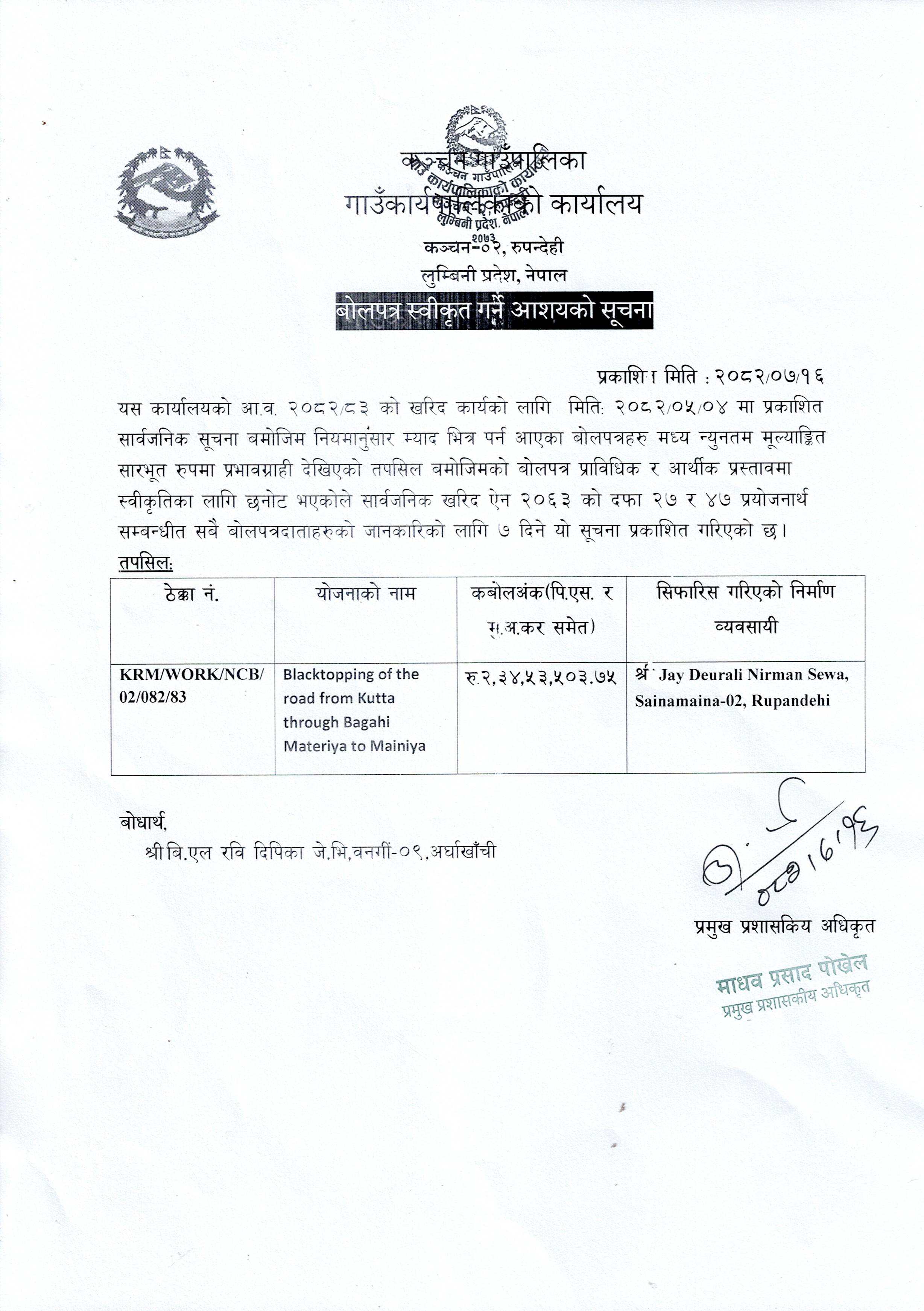बोलपत्र स्वीकृत गर्ने आशयको सूचना ।