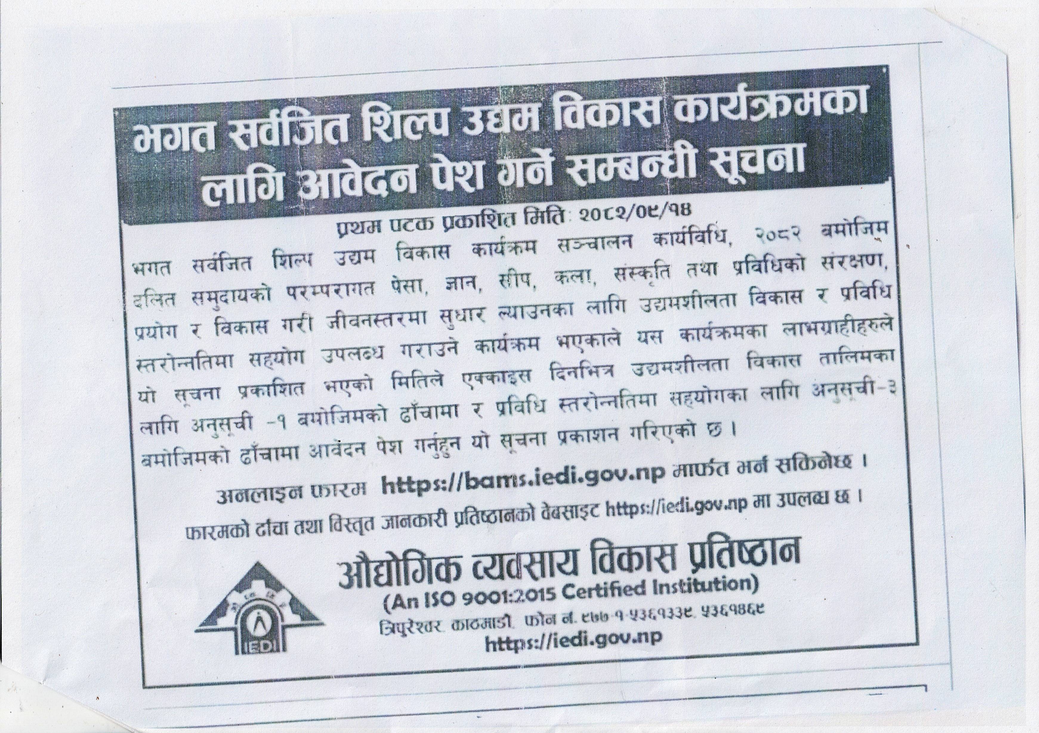 भगत सर्वजित शिल्प उद्यम विकास कार्यक्रमका लागि आवेदन पेश गर्ने सम्बन्धी सूचना ।
