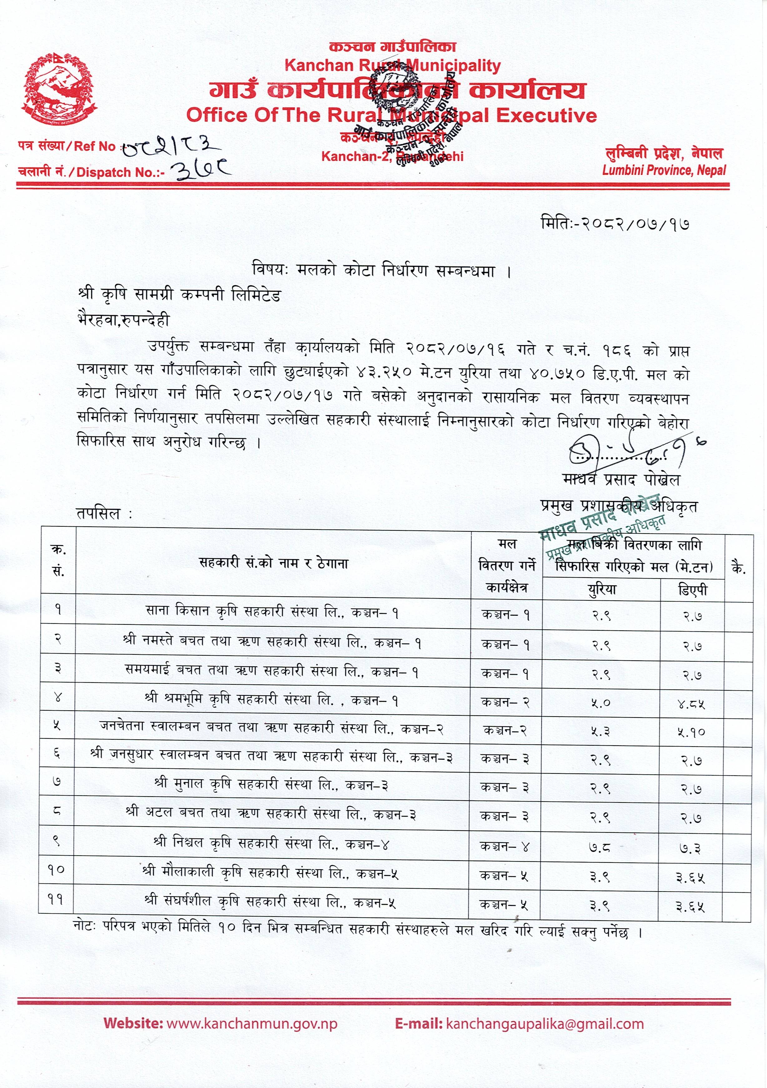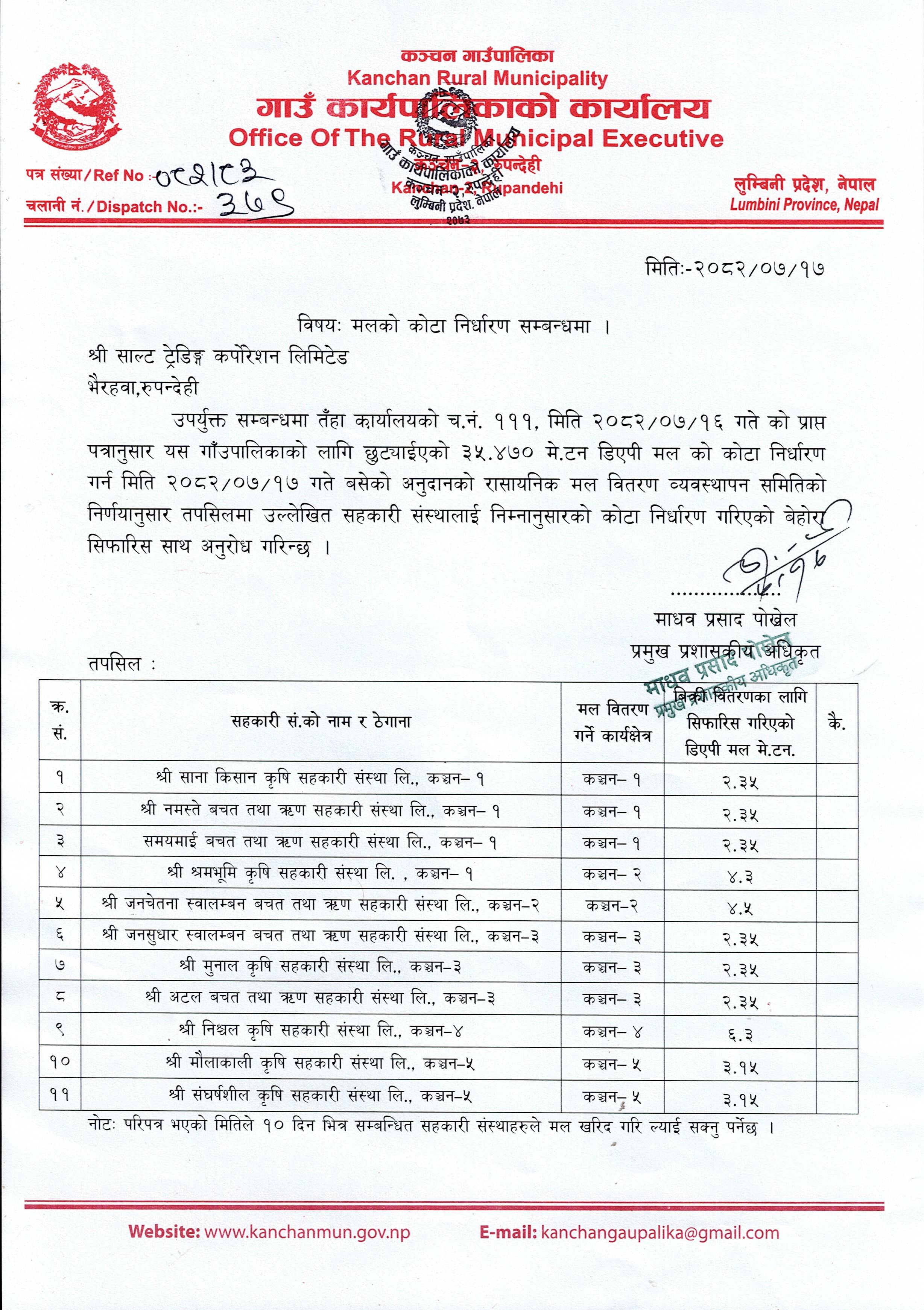 मलको कोटा निर्धारण सम्बन्धी सूचना ।