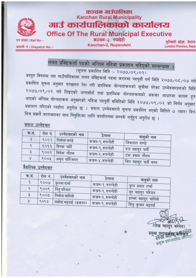 लगत प्रविष्टकर्ता पदको अन्तिम नतिजा प्रकाशन गरिएको सम्बन्धी सूचना