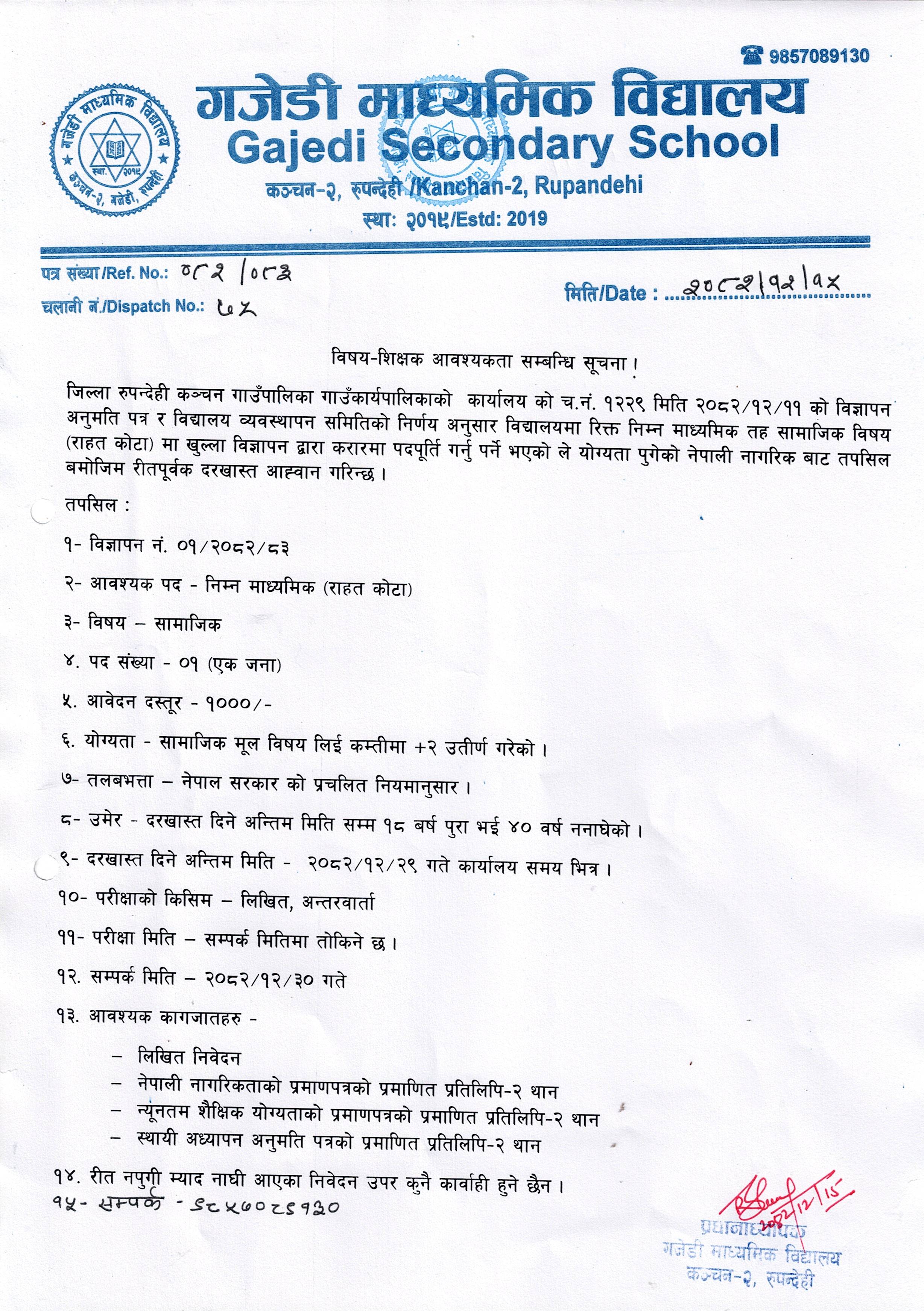 शिक्षक आवश्यकता सम्बन्धी सूचना ।