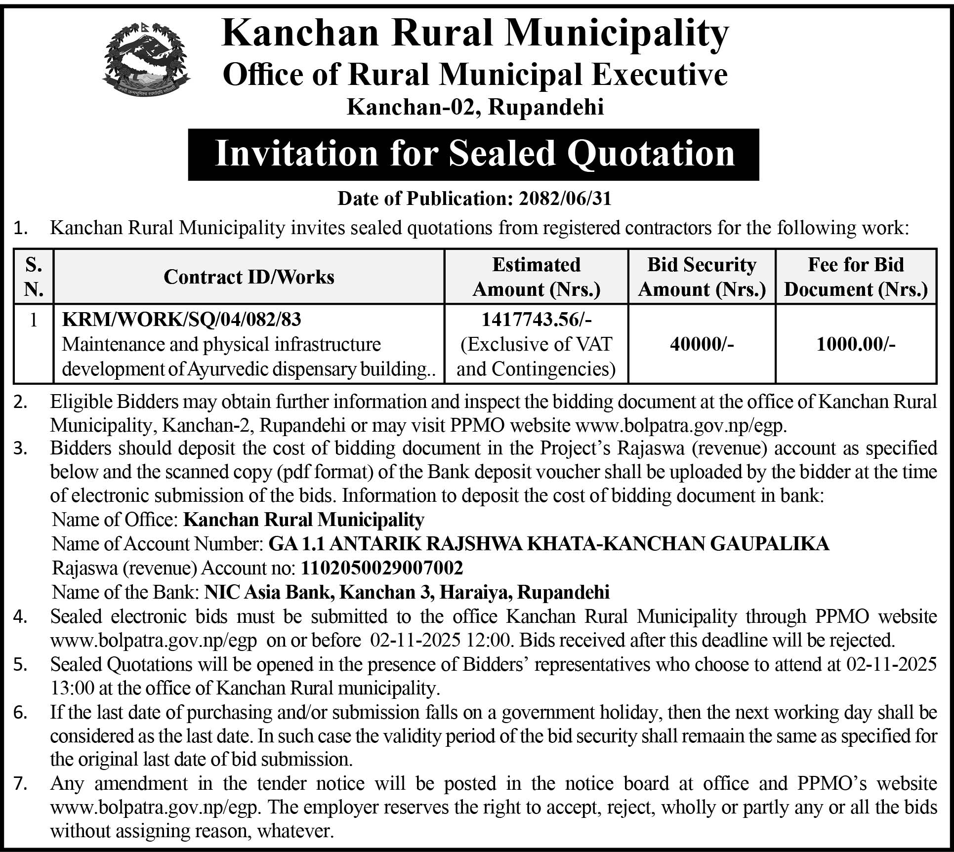 शिलवन्दी बोलपत्र आव्हानको सूचना ।